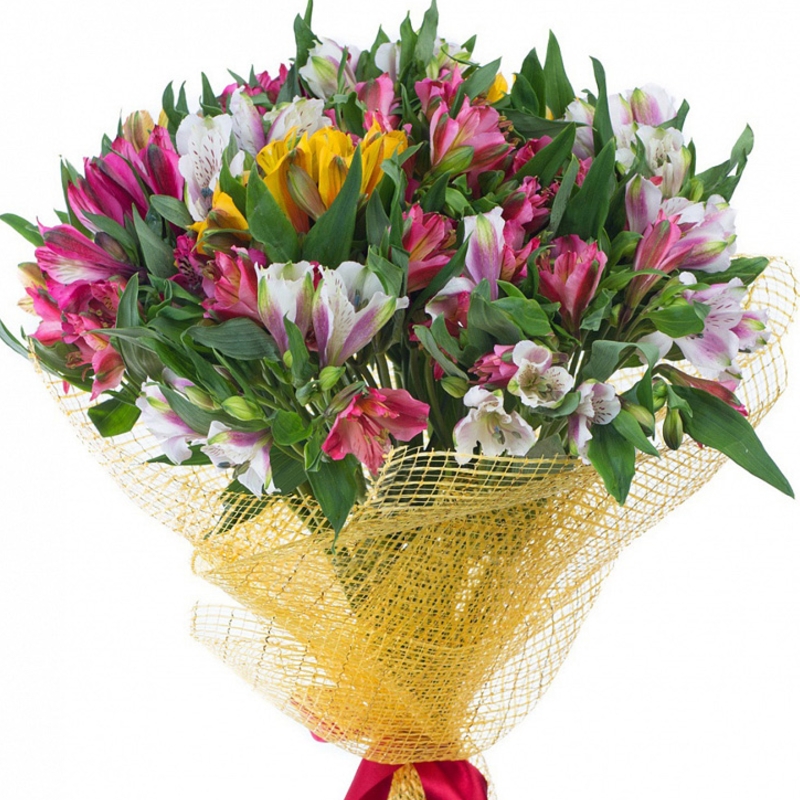 Букет состоит из MIX из 17 альстромерий, зелень, сетка, атласная лента.