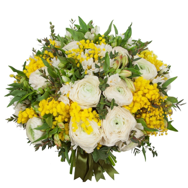 Букет состоит из 19 ранункулюсов, 5 альстромерий, 7 веток мимозы, зелень, прозрачная упаковка, атласная лента.