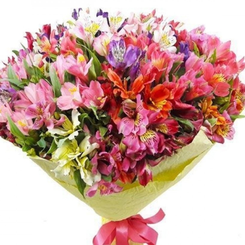 Букет состоит из 35 разноцветных альстромерий, красивая упаковка, атласная лента.