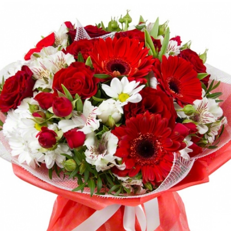 Букет состоит из 3 гербера, 5 роз, 4 альстромерии, 3 кустовые хризантемы, зелень, красивая упаковка, атласная лента.