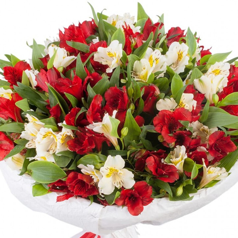 Букет состоит из 19 веток красных и белых альстромерий, зелень, красивая упаковка, атласная лента.