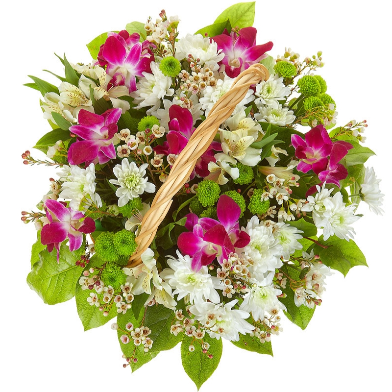 Букет состоит из 7 орхидей, 4 ветки кустовой хризантемы, 4 ветки хризантемы Сантини, 3 альстромерии, 3 ветки ваксфлауэра, зелень, корзина, оазис.