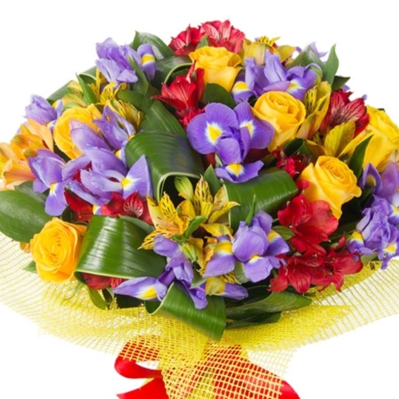 Букет состоит из 7 желтых роз, 15 ирисов, 11 желтых и белых альстромерий, аспидистра, сетка, атласная лента.