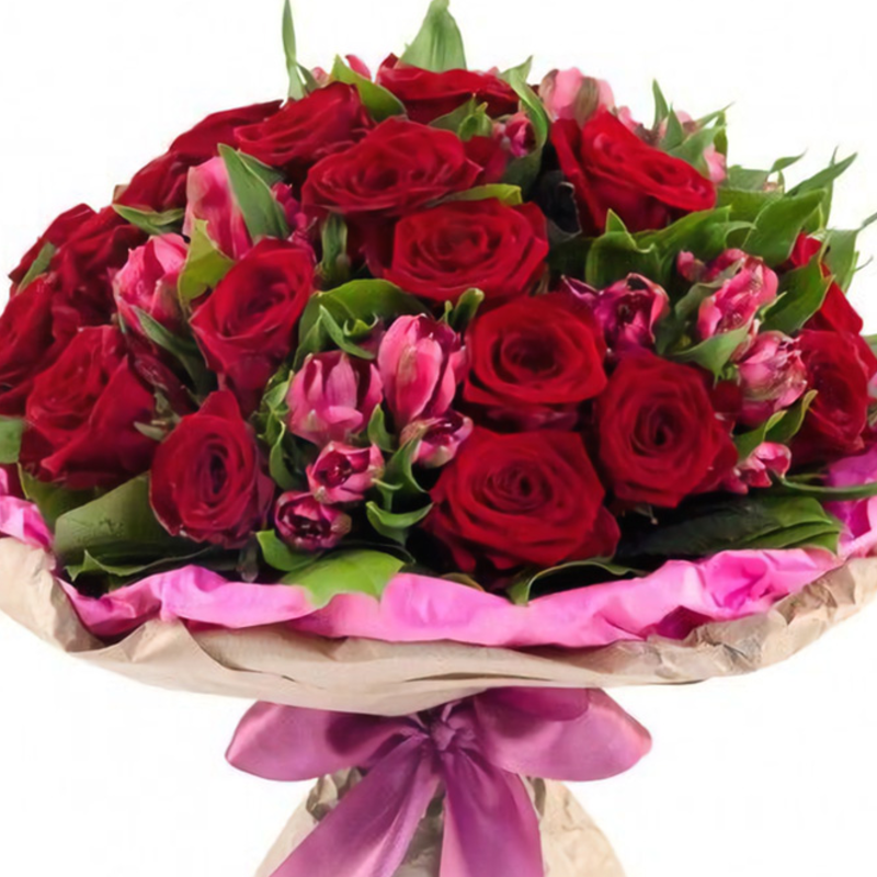 Букет состоит из 21 красная роза, 6 розовых альстромерий, зелень, крафт, атласная лента.