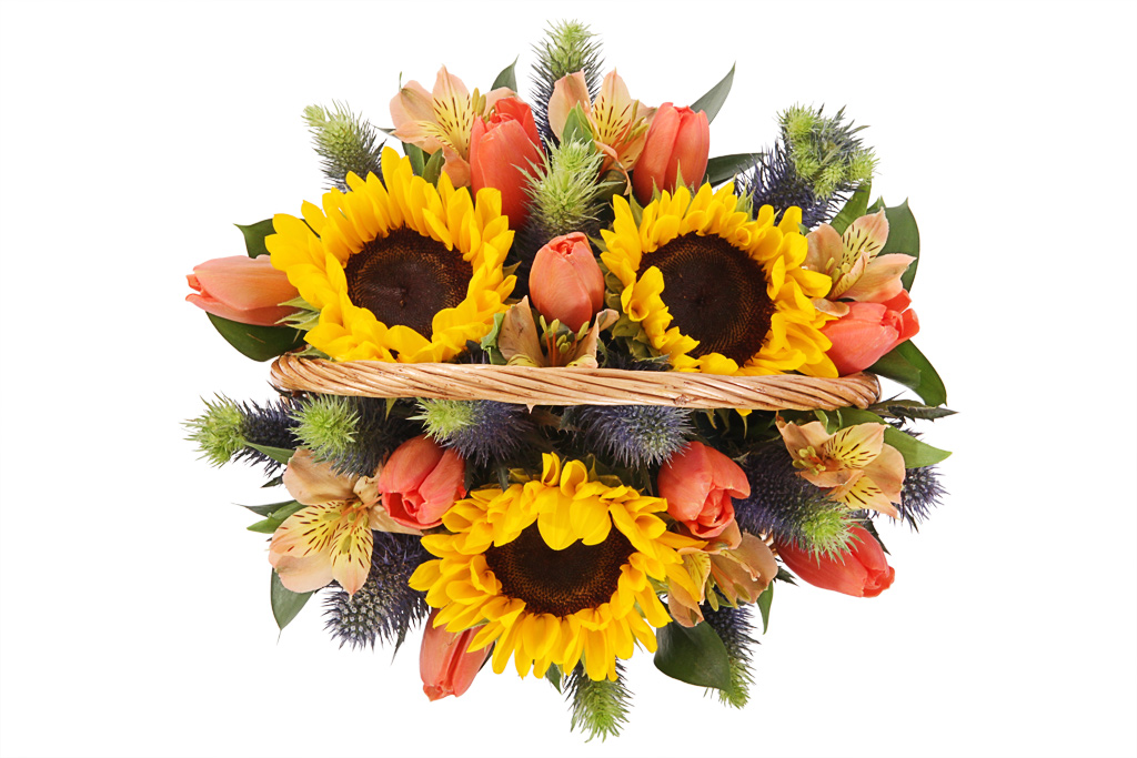 Букет состоит из 3 подсолнуха, 9 тюльпанов, 1 альстромерия, 3 ветки эрингиума, зелень, корзина, оазис.