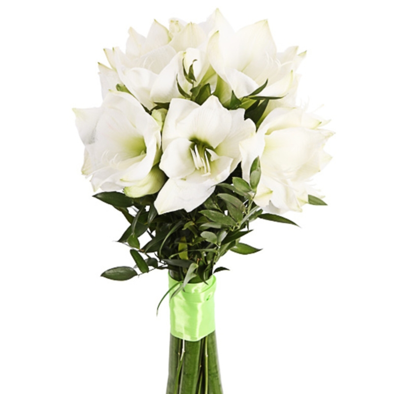 Букет состоит из 5 белых амариллисов, зелень, прозрачная упаковка, атласная лента.