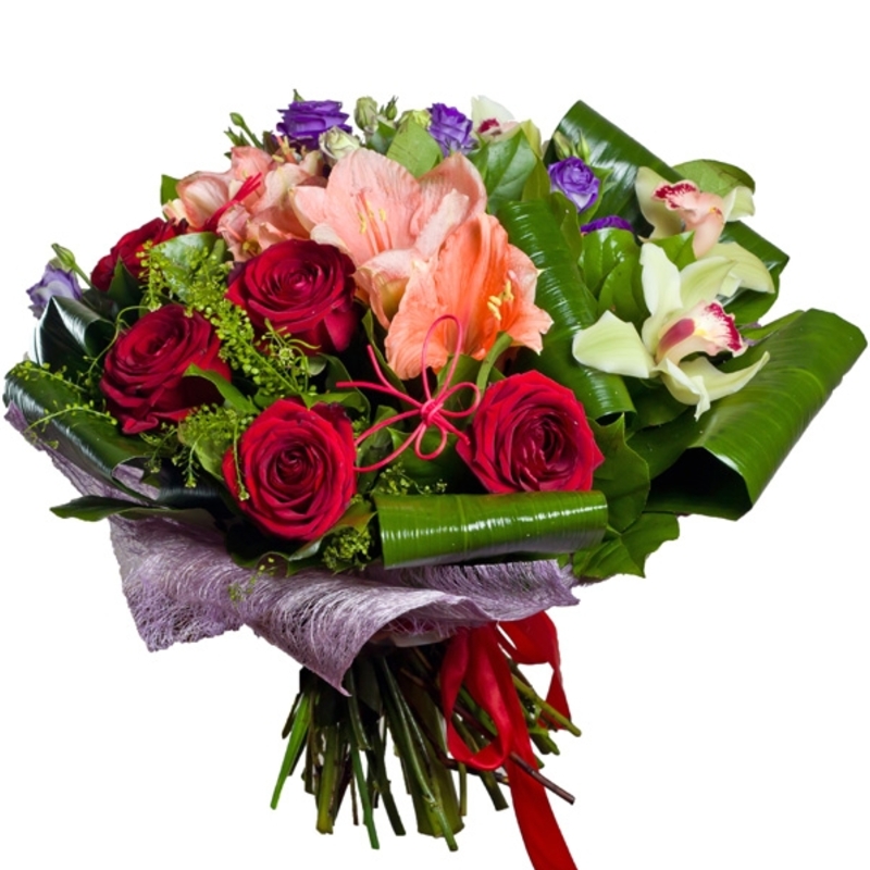 Букет состоит из 5 роз, 3 ветки эустомы, 1 амариллис, 1 орхидея, аспидистра, зелень, красивая упаковка, атласная лента.