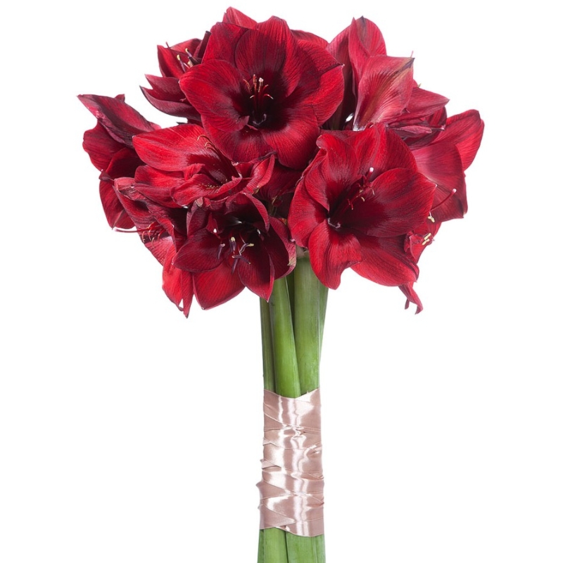 Букет состоит из 5 красных амариллисов, прозрачная упаковка, атласная лента.
