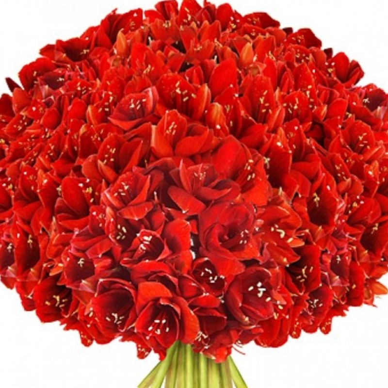 Букет состоит из 45 красных амариллисов, прозрачная упаковка, атласная лента.