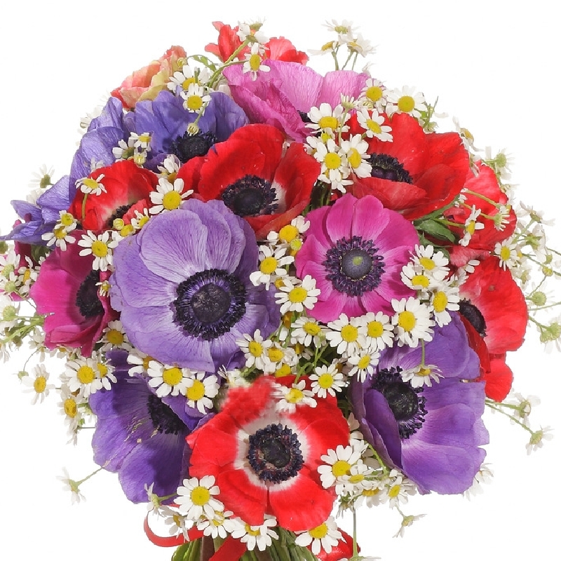Букет состоит из MIX из 21 анемона, 6 веток танацетума, прозрачная упаковка, атласная лента.