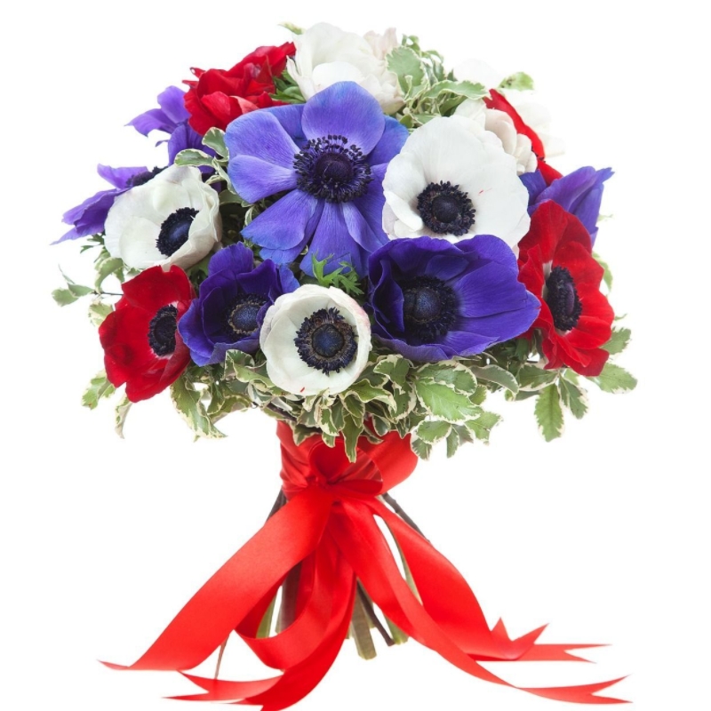 Букет состоит из MIX из 21 анемона, зелень, прозрачная упаковка, атласная лента.