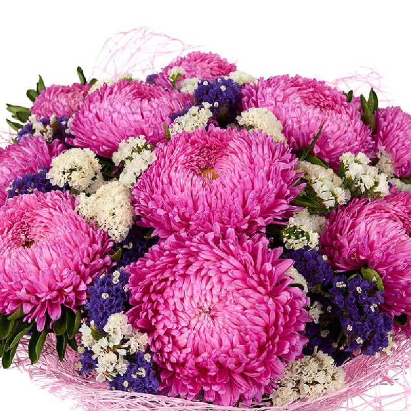 Букет состоит из 13 розовых астр, 5 статица, зелень, красивая упаковка, атласная лента.