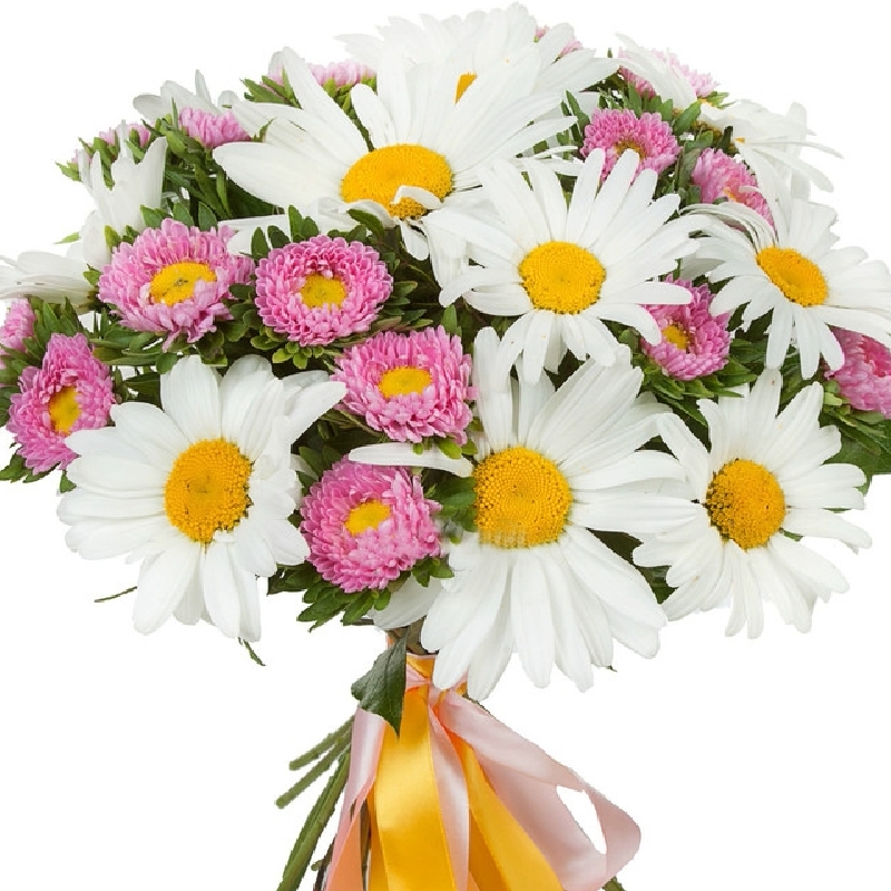 Букет состоит из 15 ромашек, 10 розовых астр, зелень, прозрачная упаковка, атласная лента.