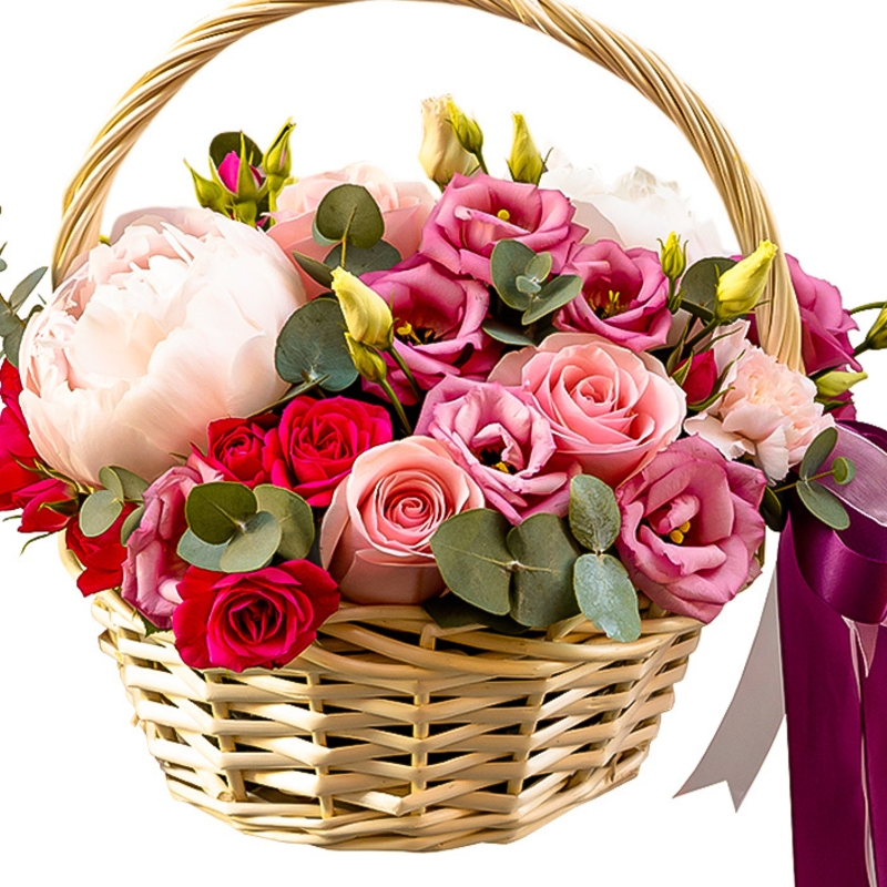 Букет состоит из 2 пиона, 3 розы, 2 ветки кустовой розы, 2 ветки эустомы, 2 гвоздики, зелень, корзина, оазис.