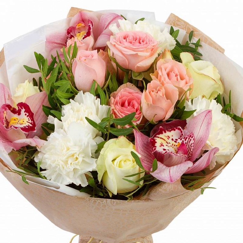 Букет состоит из 10 роз, 4 гвоздики, 3 орхидеи, зелень, крафт, атласная лента.