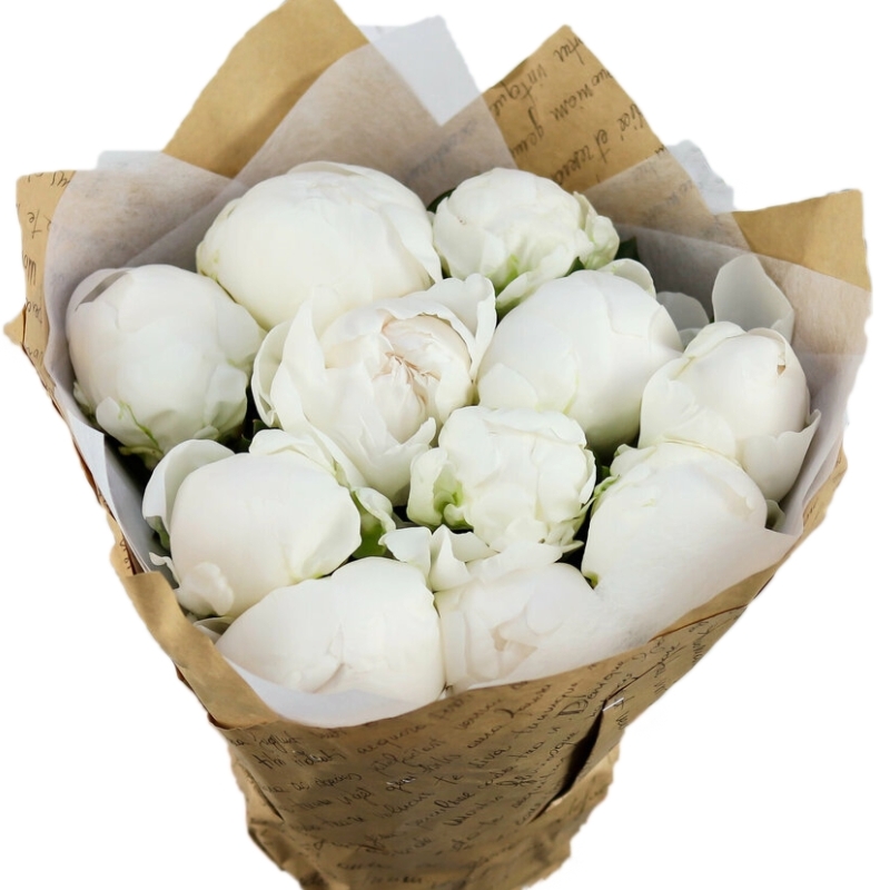 Букет состоит из 11 белых пионов, крафт, атласная лента.