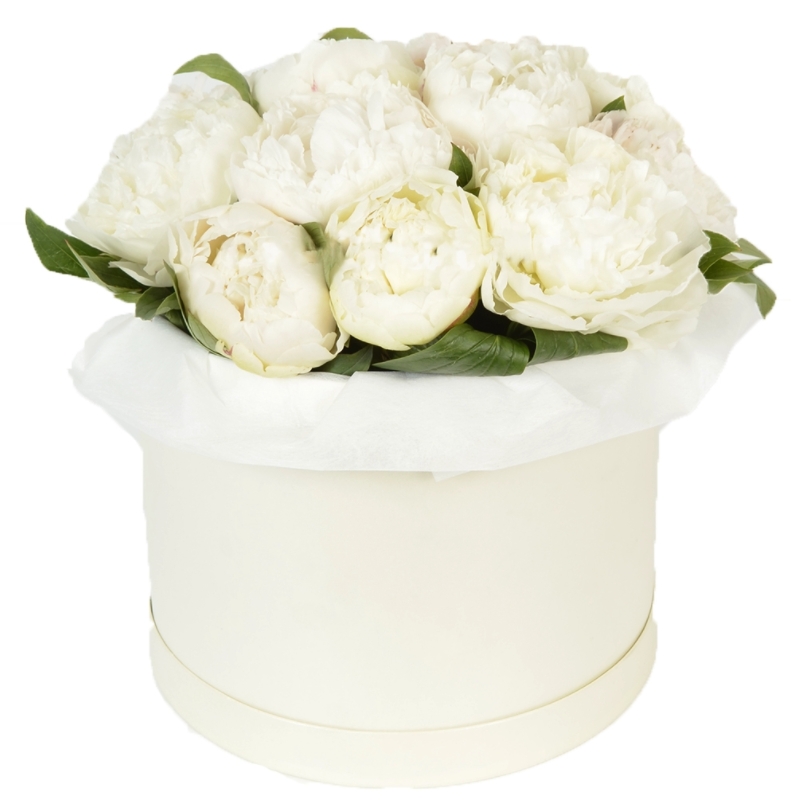 Букет состоит из 15 белых пионов, зелень, коробка, оазис.