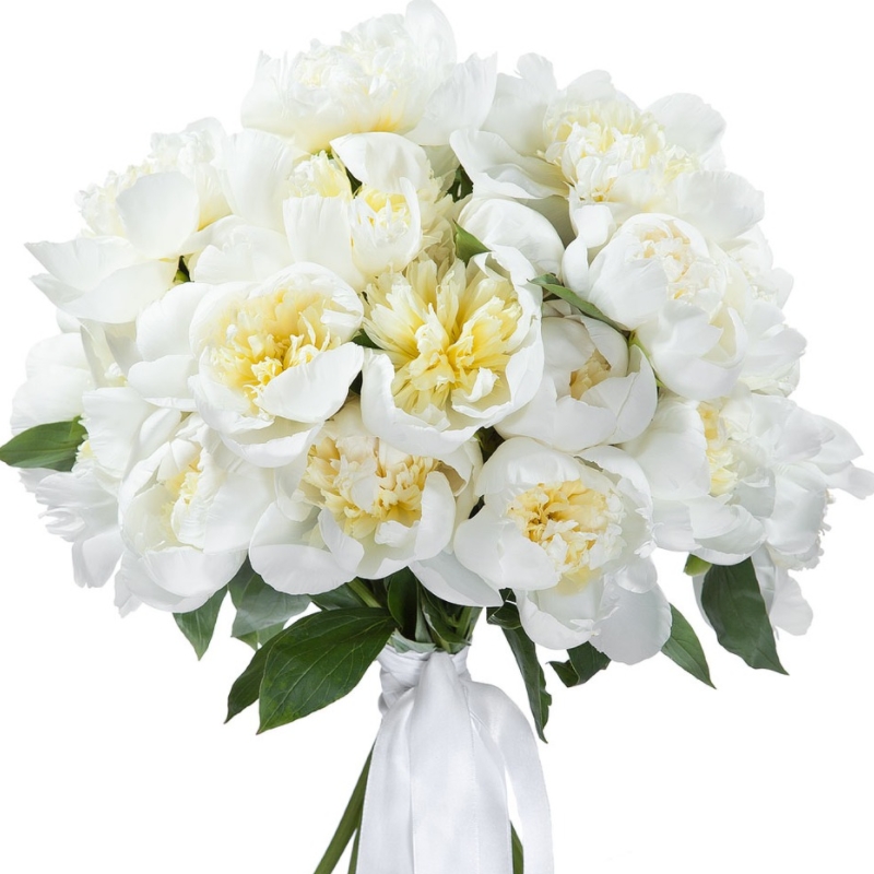 Букет состоит из 31 белый пион, прозрачная упаковка, атласная лента.
