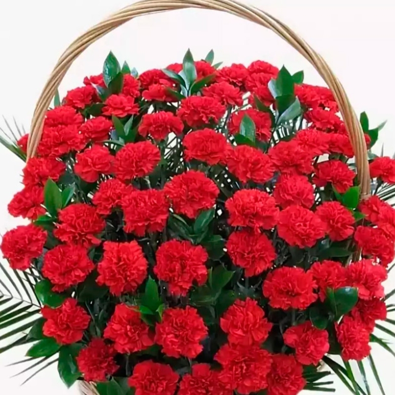 26 красных гвоздик, 25 белых гвоздик, зелень, корзина, оазис.