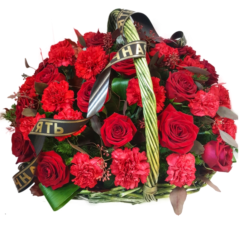 16 красных роз, 20 красных гвоздик, зелень, корзина, оазис, траурная лента.