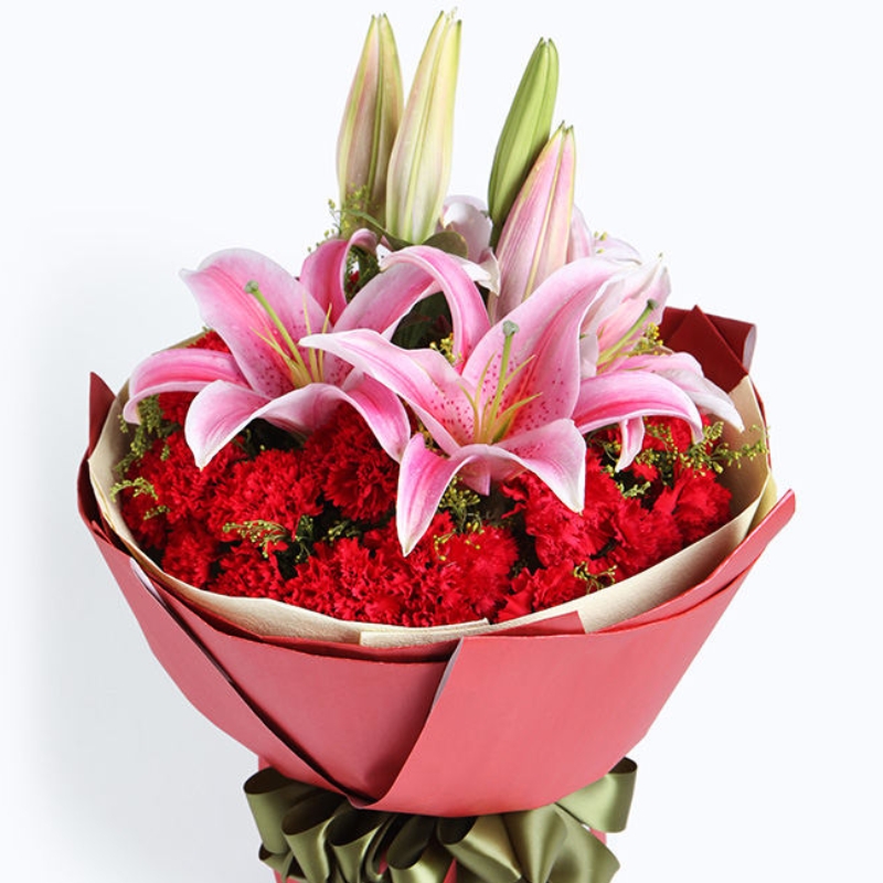 Букет состоит из 27 красных гвоздик, 3 лилии, зелень, красивая упаковка, атласная лента.
