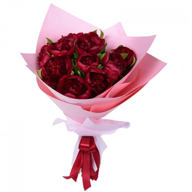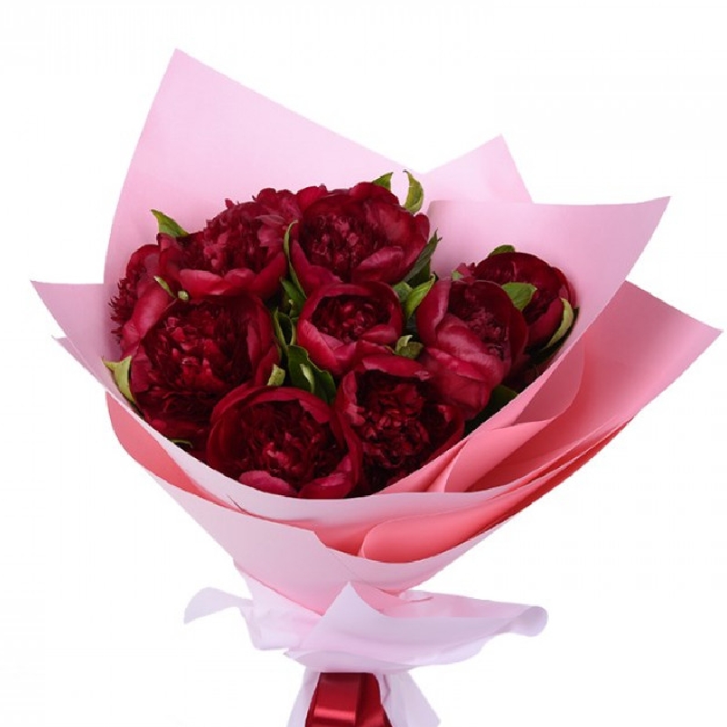 Букет состоит из 9 пионов, зелень, красивая упаковка, атласная лента.