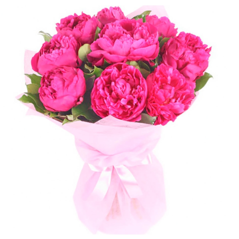 Букет состоит из 9 красных пионов, салал, красивая упаковка, атласная лента.