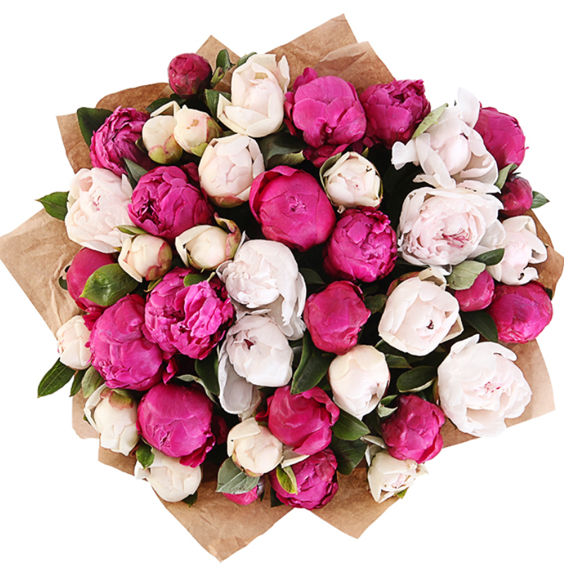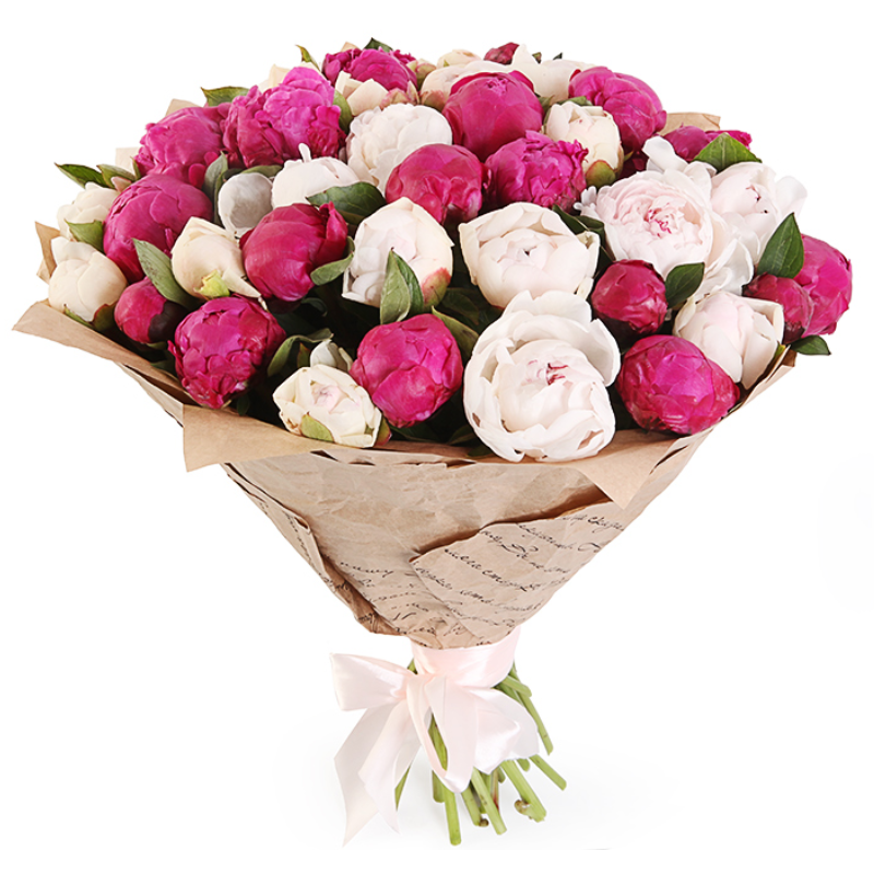 Букет состоит из 17 красных пионов, 18 белых пионов, крафт, атласная лента.