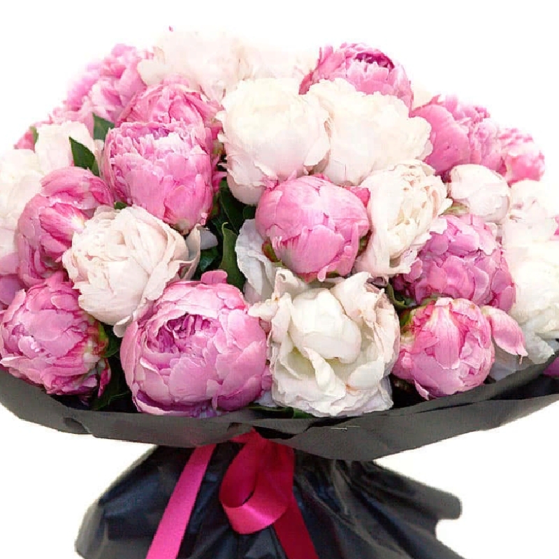 Букет состоит из 23 розовых пионов, 22 белых пиона, крафт, атласная лента.