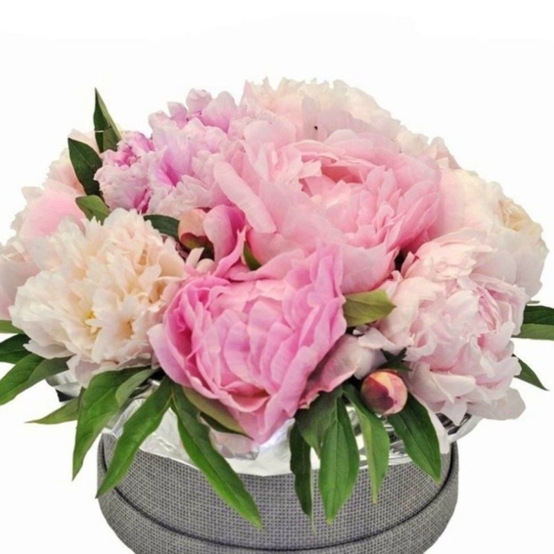 Букет состоит из 11 разноцветных пионов, зелень, коробка, оазис.