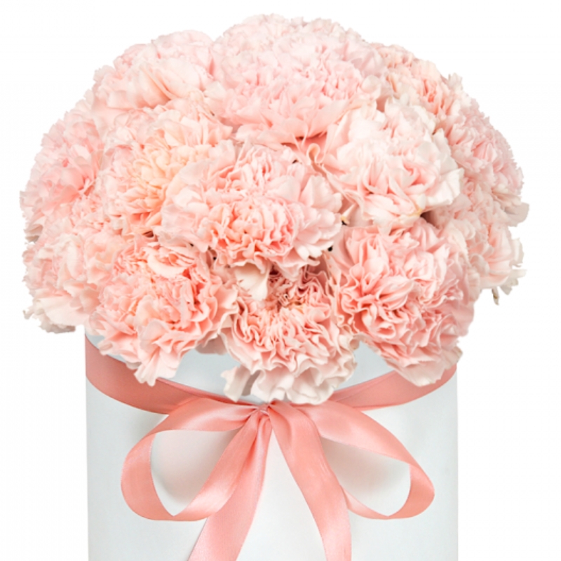 Букет состоит из 27 розовых гвоздик, коробка, атласная лента, оазис.