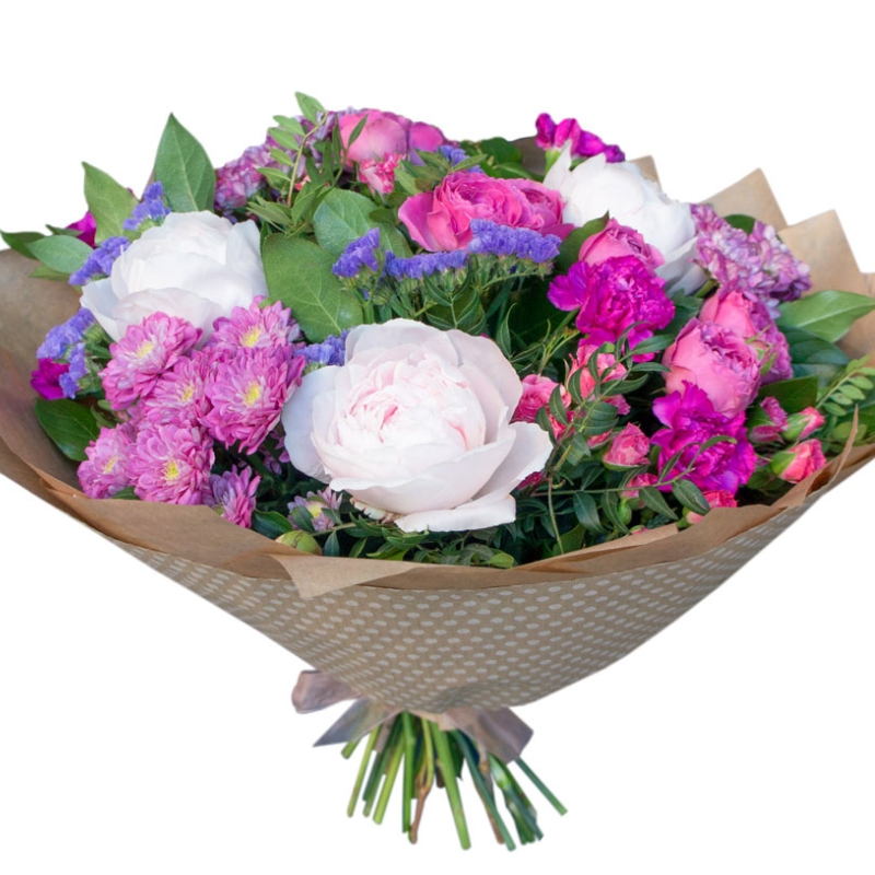 Букет состоит из 3 пиона, 3 ветки хризантемы, 4 ветки кустовых роз, 7 гвоздик, 3 статица, зелень, крафт, атласная лента.