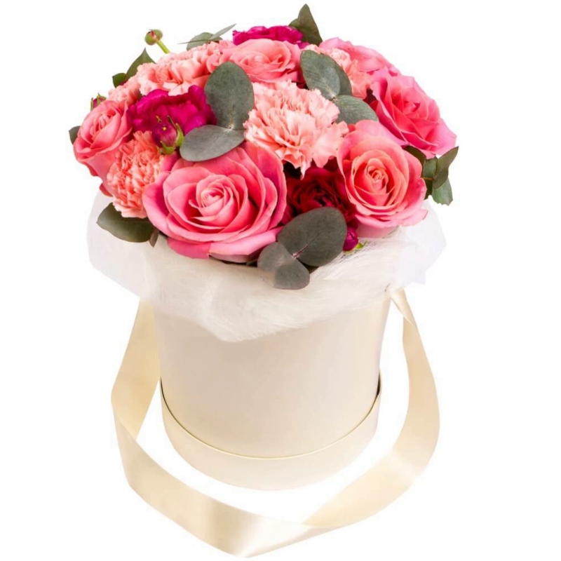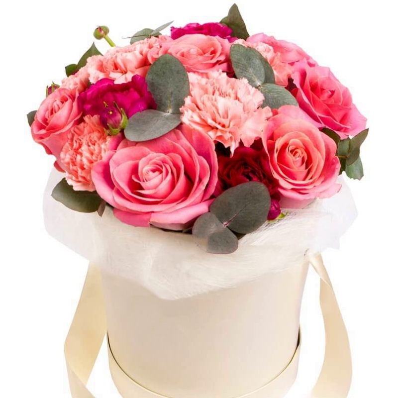 Букет состоит из 6 розовых роз, 5 розовых хризантем, 2 красные розы, 1 ветка кустовой пионовидной розы, коробка, оазис.