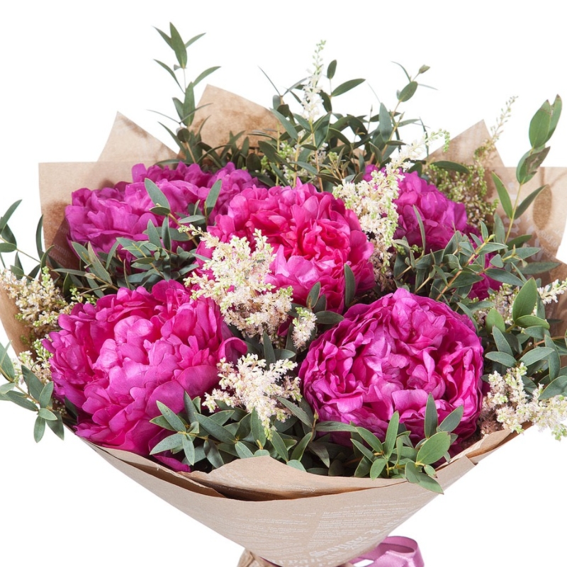 Букет состоит из 5 пионов, декоративная зелень, крафт, атласная лента.