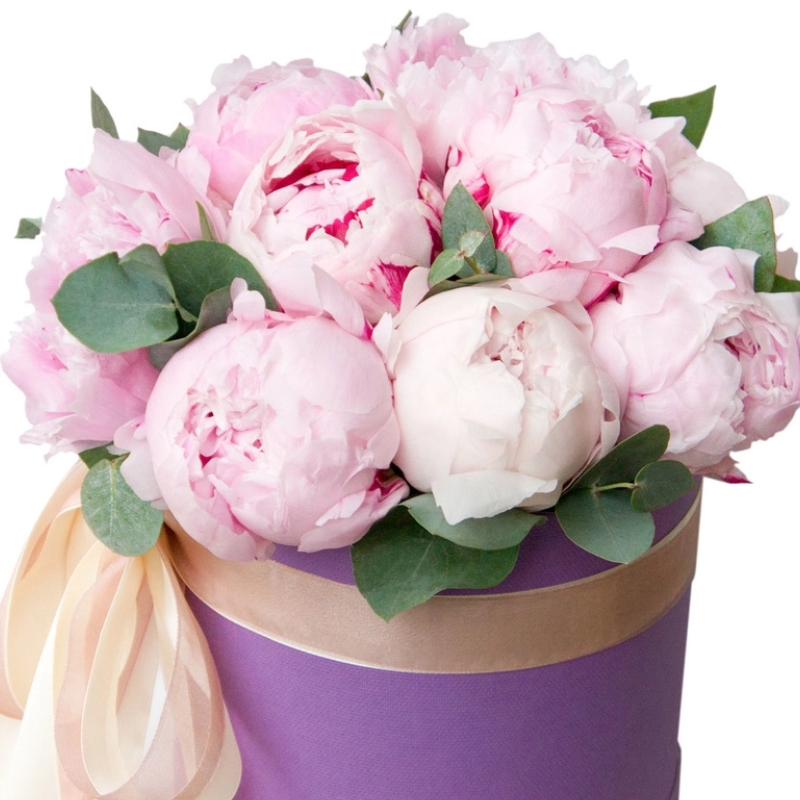 Букет состоит из 11 розовых пионов, зелень, коробка, атласная лента, оазис.