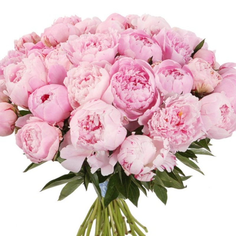 Букет состоит из 35 розовых пионов, прозрачная упаковка, атласная лента.