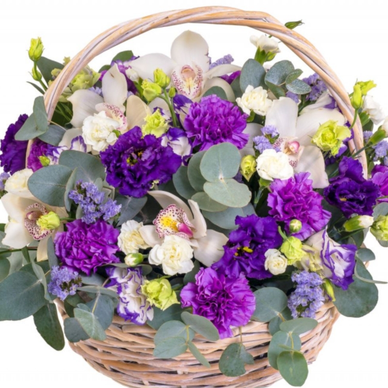 Букет состоит из 15 гвоздик, 6 веток эустомы, 5 орхидей, 3 ветки статицы, корзина, оазис.