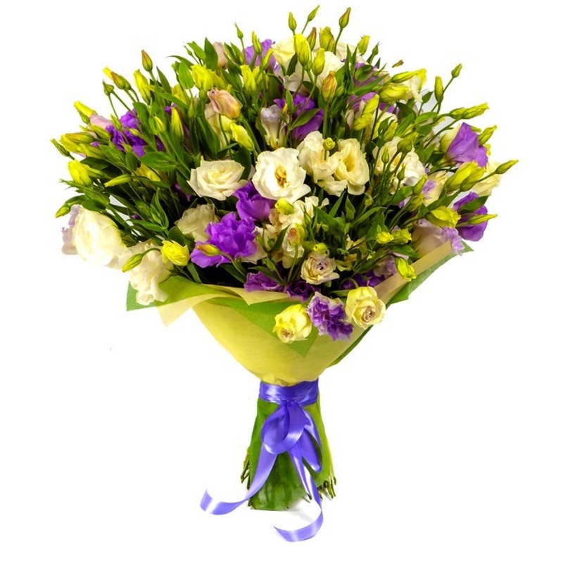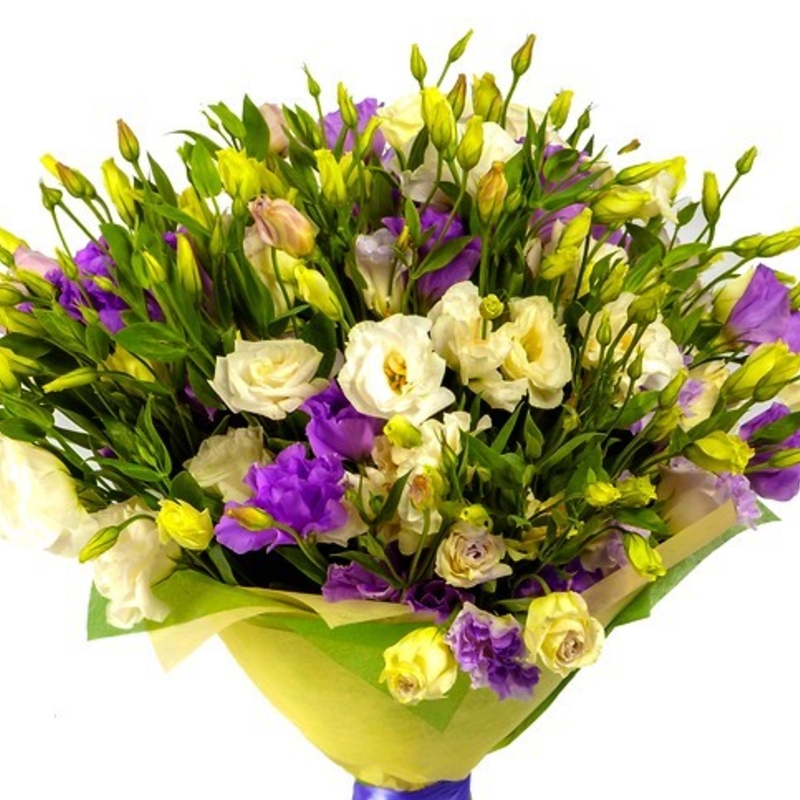Букет состоит из 25 веток белой и сиреневой эустомы, зелень, красивая упаковка, атласная лента.