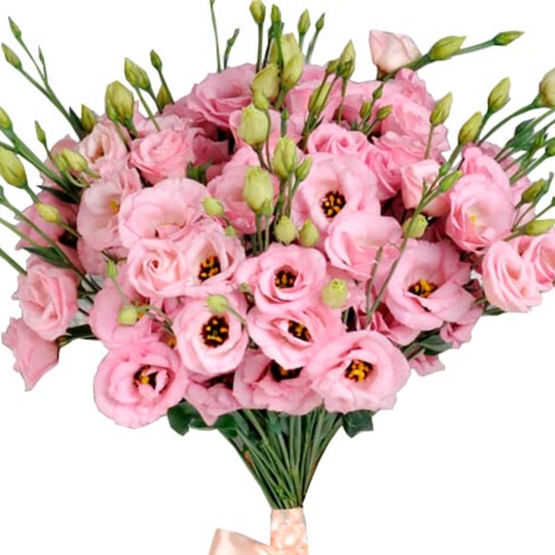Букет состоит из 19 веток розовой эустомы, прозрачная упаковка, атласная лента.