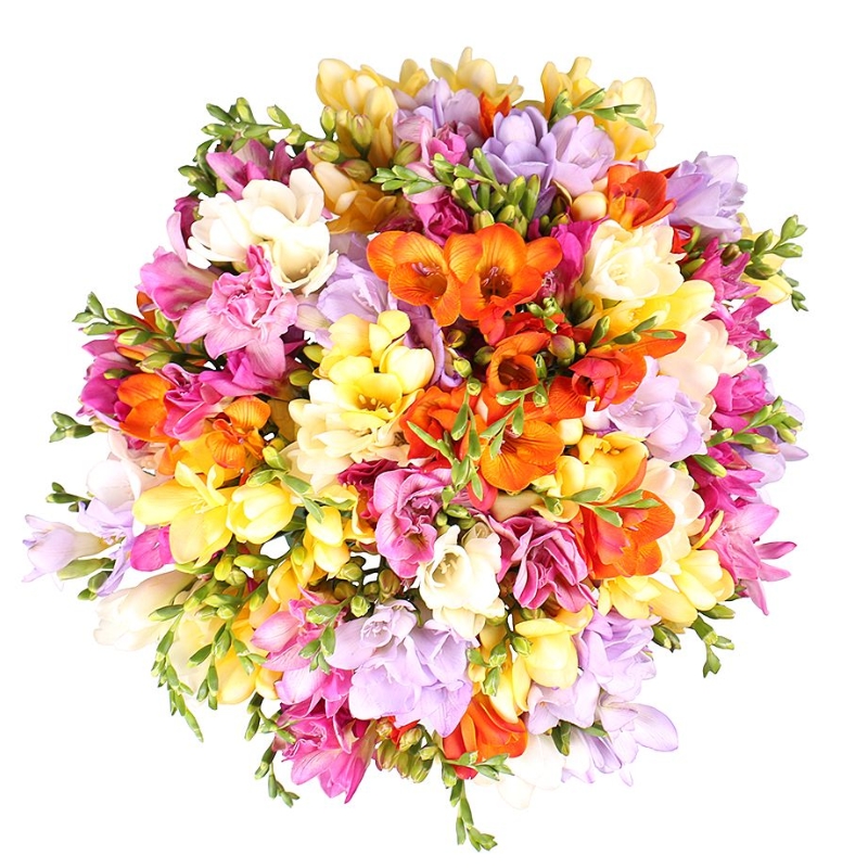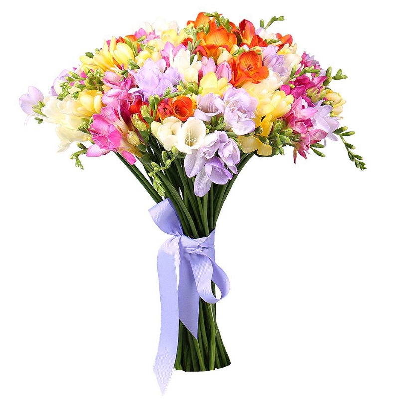 Букет состоит из MIX из 45 фрезий, прозрачная упаковка, атласная лента.