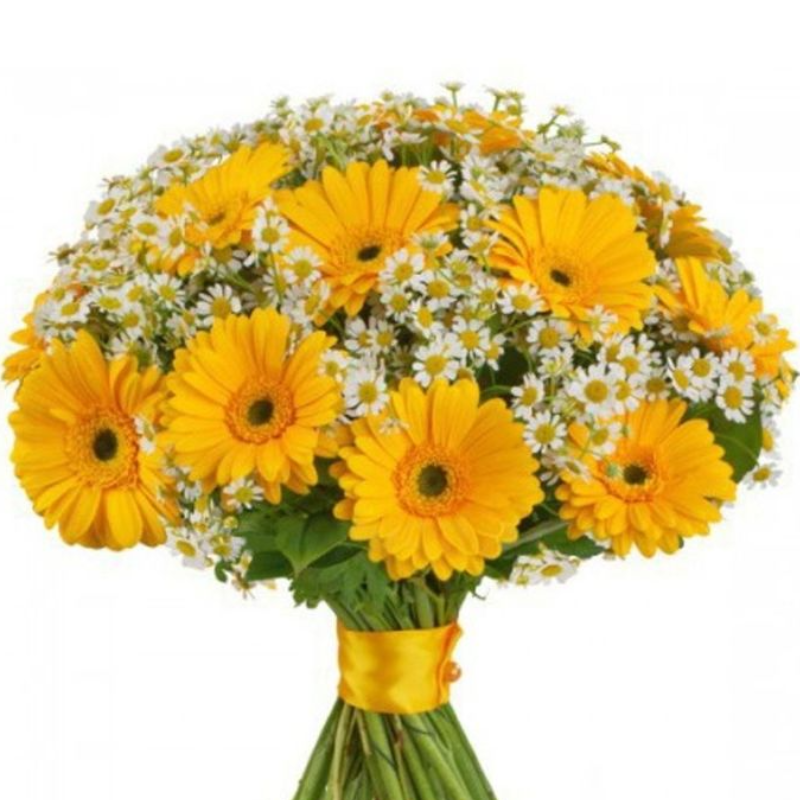 Букет состоит из 19 желтых гербер, 15 танацетум, салал, прозрачная упаковка, желтая лента.