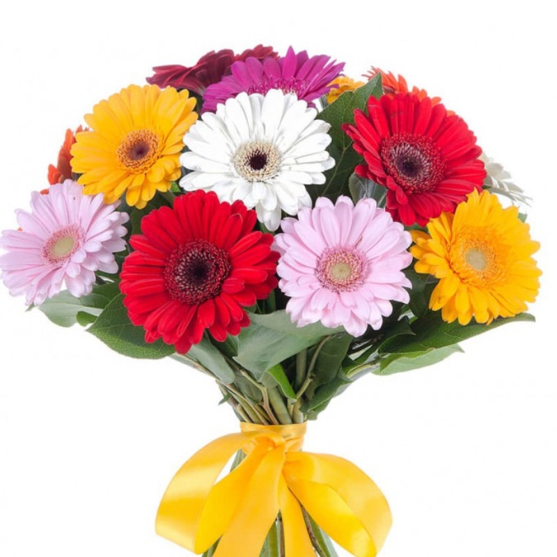 Букет состоит из MIX из 17 гербер, прозрачная упаковка, атласная лента.