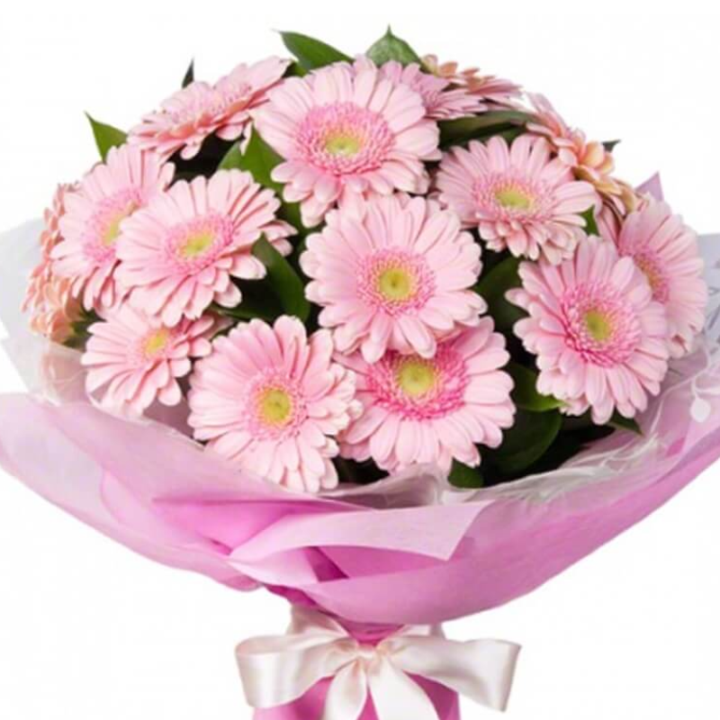 Букет состоит из 21 розовый гербер, розовая упаковка, атласная лента.
