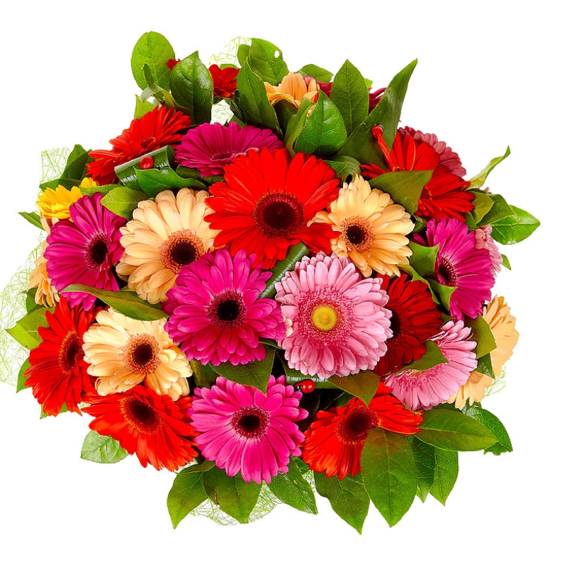 Букет состоит из MIX из 25 гербер, аспидистра, салал, красивая упаковка, атласная лента.