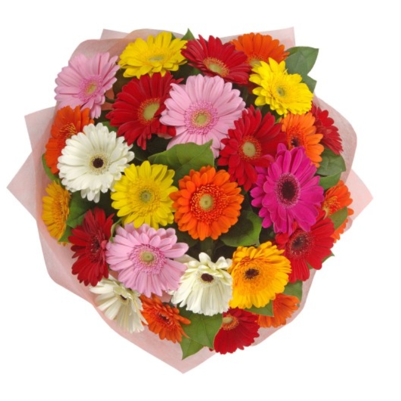 Букет состоит из MIX из 35 гербер, красивая упаковка, атласная лента.