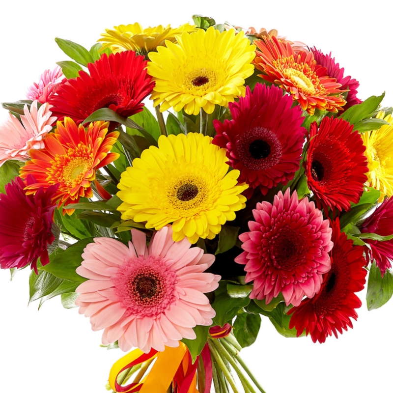 Букет состоит из MIX из 19 гербер, красивая упаковка, атласная лента.