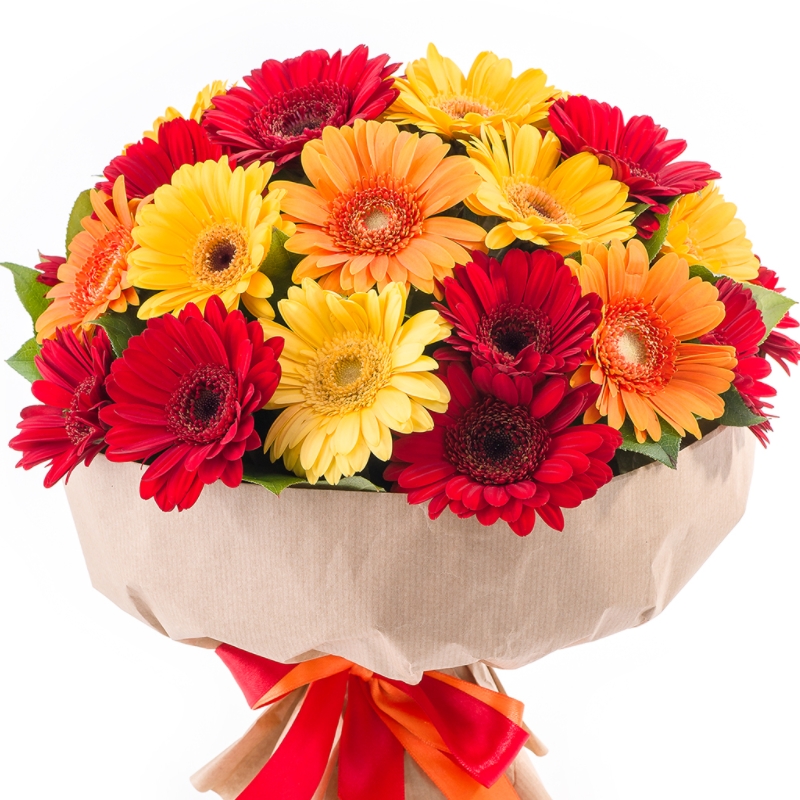 Букет состоит из MIX из 29 гербер, салал, крафт, атласная лента.