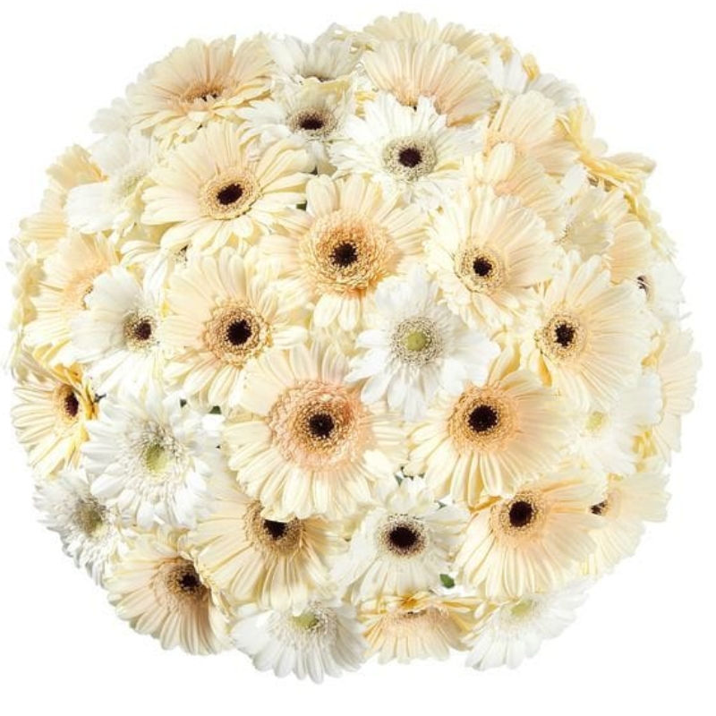 Букет состоит из 35 белых гербер, прозрачная упаковка, атласная лента.