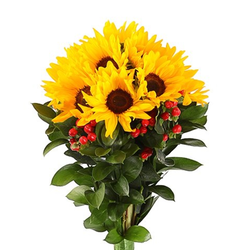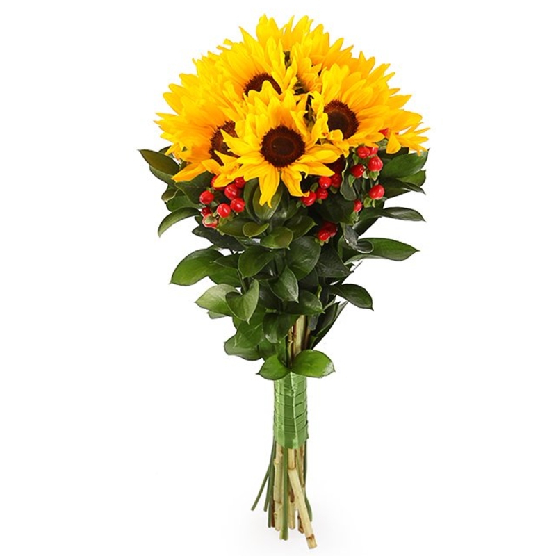 Букет состоит из 11 подсолнухов, 6 веток гиперикума, зелень, прозрачная упаковка, атласная лента.