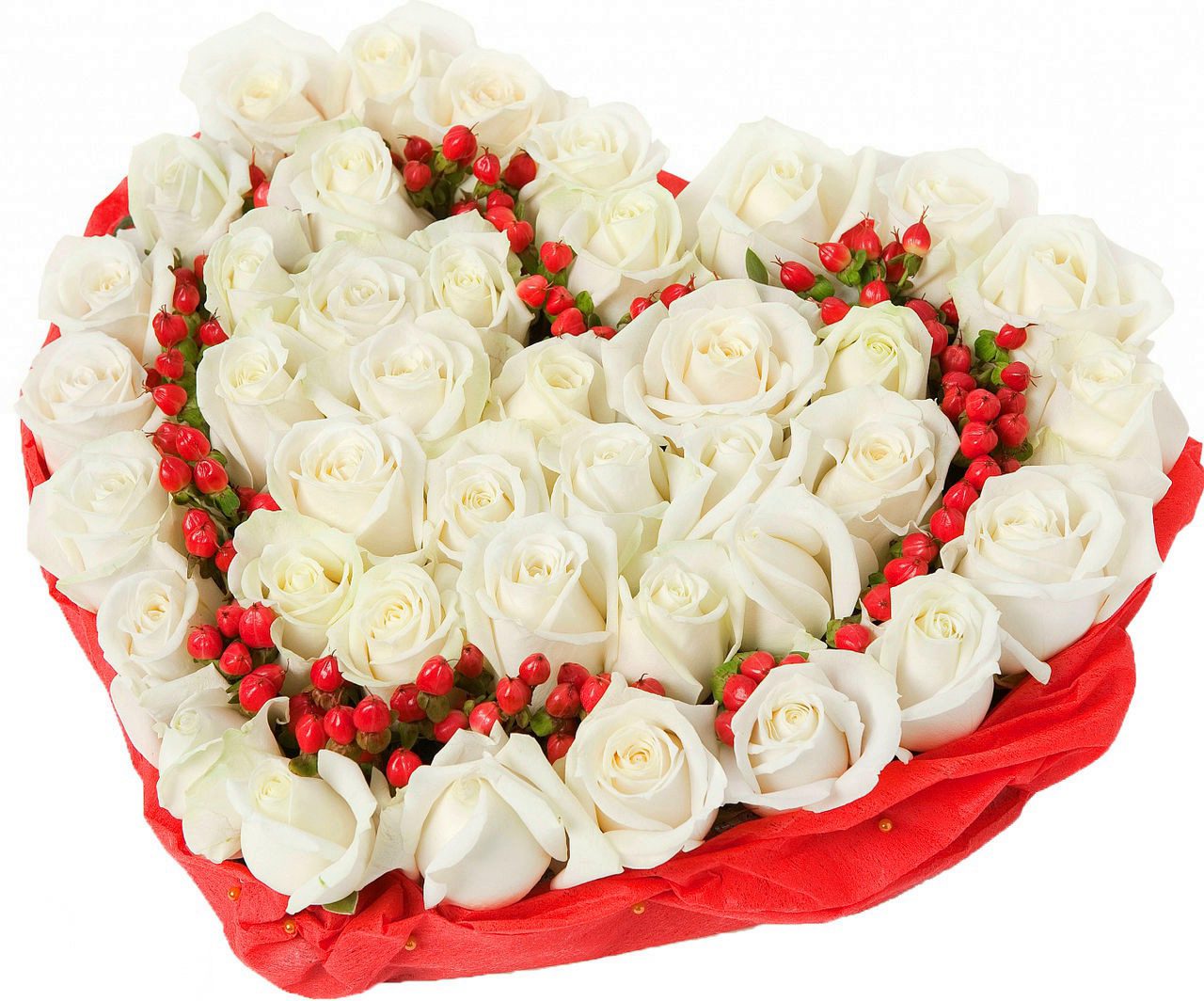 Композиция "Сердце" из 41 белой розы и гиперикума